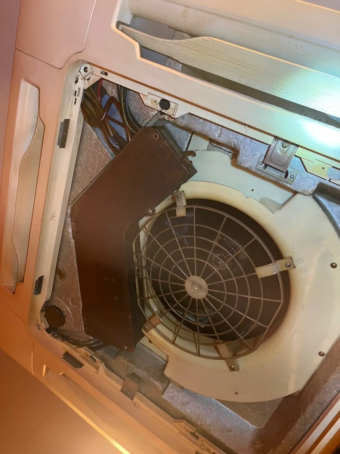 九州の事例では、内装工事も丁寧に仕上がっており、施工会社側にも明確な過失は見当たりませんでした。それでも、稼働からわずか数ヶ月で天井裏からカビ臭がし始め、点検口を開けたところ、梁や配管周辺、断熱材にまで黒カビが広がっているのが確認されました。さらに、壁面内部のボード材や、エアコンのドレンパン・ファン周辺にもカビが付着しており、全面的な除菌作業が必要となりました。