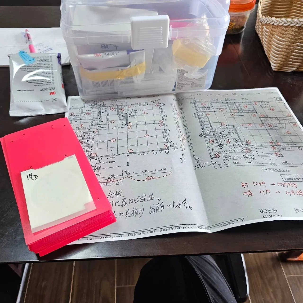 A4 床面積40 ㎡程度の一般住宅なら採取30~45分、環境調査を含めて1時間半前後です。料金は検体数とエリア数によりますが、目安として税込36,000円から。詳細はお問い合わせ時にお見積もりを提示いたします。