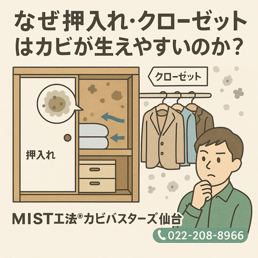 それでも「点カビが広がってしまった」「カビ臭が取れない」「健康への影響が心配」という場合は、無理せずプロに相談してください。特に仙台エリアでは、地域の気候特性(湿気の多い梅雨や寒暖差の大きい冬)もあり、押入れやクローゼットがカビに悩まされやすい環境です。早めに専門家へ相談することで、被害を最小限に抑えられます。