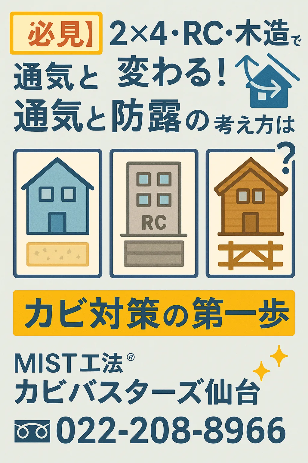 このブログでは、2×4・RC・木造それぞれの特徴と、通気・防露のポイントを分かりやすく整理していきます。ぜひ最後まで読んでいただき、ご自身の住まいの“見えないリスク”をチェックしてみてくださいね👀✨。もし実際に「カビかも?」という心配や不安を感じたら、早めの相談が安心への近道です。仙台の皆さまの住まいの健康を守るために、MIST工法®カビバスターズ仙台が力になりますので、気軽にお問い合わせください📞🌿