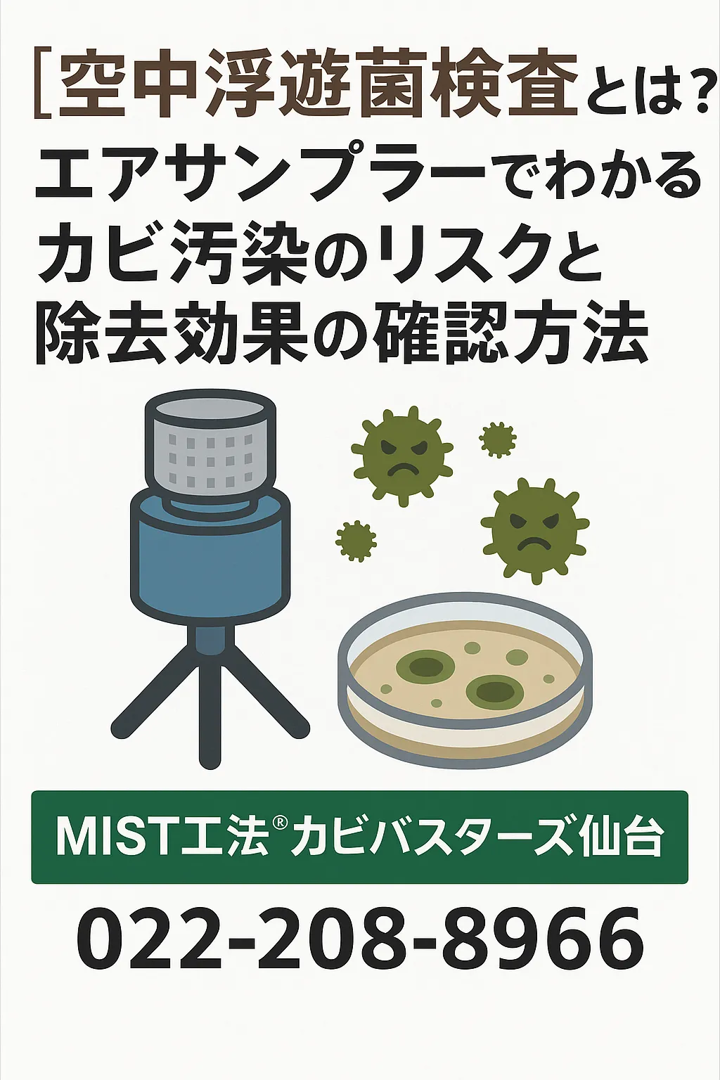 「カビの臭いがするけど原因がわからない」「除去後に本当に効果が出ているのか不安…」と感じている方にとって、空中浮遊菌検査は大変有効な手段です。仙台でカビ問題に悩まれている方は、ぜひお気軽にMIST工法®カビバスターズ仙台までご相談ください。専門スタッフが安心できる環境づくりのお手伝いをいたします💡