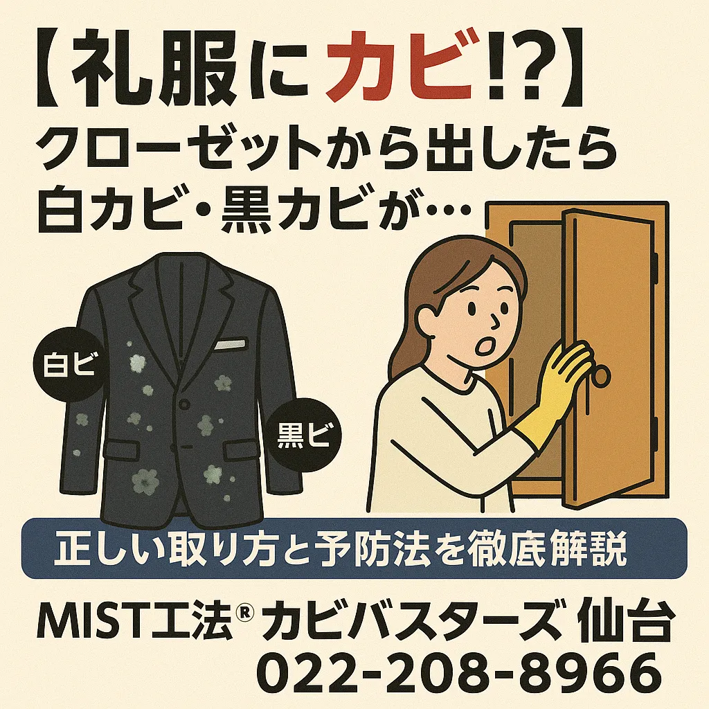 そして、もし「気づいたら広範囲にカビが…」という状況になってしまったら、自宅で無理に落とそうとすると生地を傷める恐れがあります。そんな時は専門家に相談することで、大切な礼服を守ることができます。仙台でカビにお困りの際は、ぜひMIST工法®カビバスターズ仙台へお気軽にご相談ください😊。