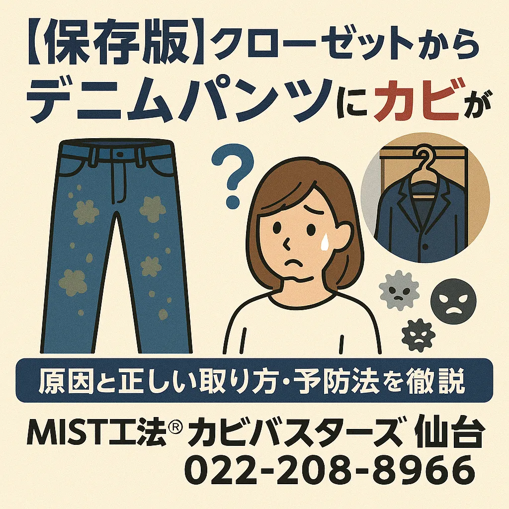 突然ですが、季節の変わり目や久しぶりにお気に入りの洋服を出したときに「えっ😱!?」と驚いた経験はありませんか?特にデニムパンツは丈夫で長持ちするアイテムですが、実はクローゼットの環境によってはカビが発生してしまうことがあります。せっかくのおしゃれなデニムに白や黒のカビがポツポツ…なんて光景は、がっかりどころかショックそのものですよね。