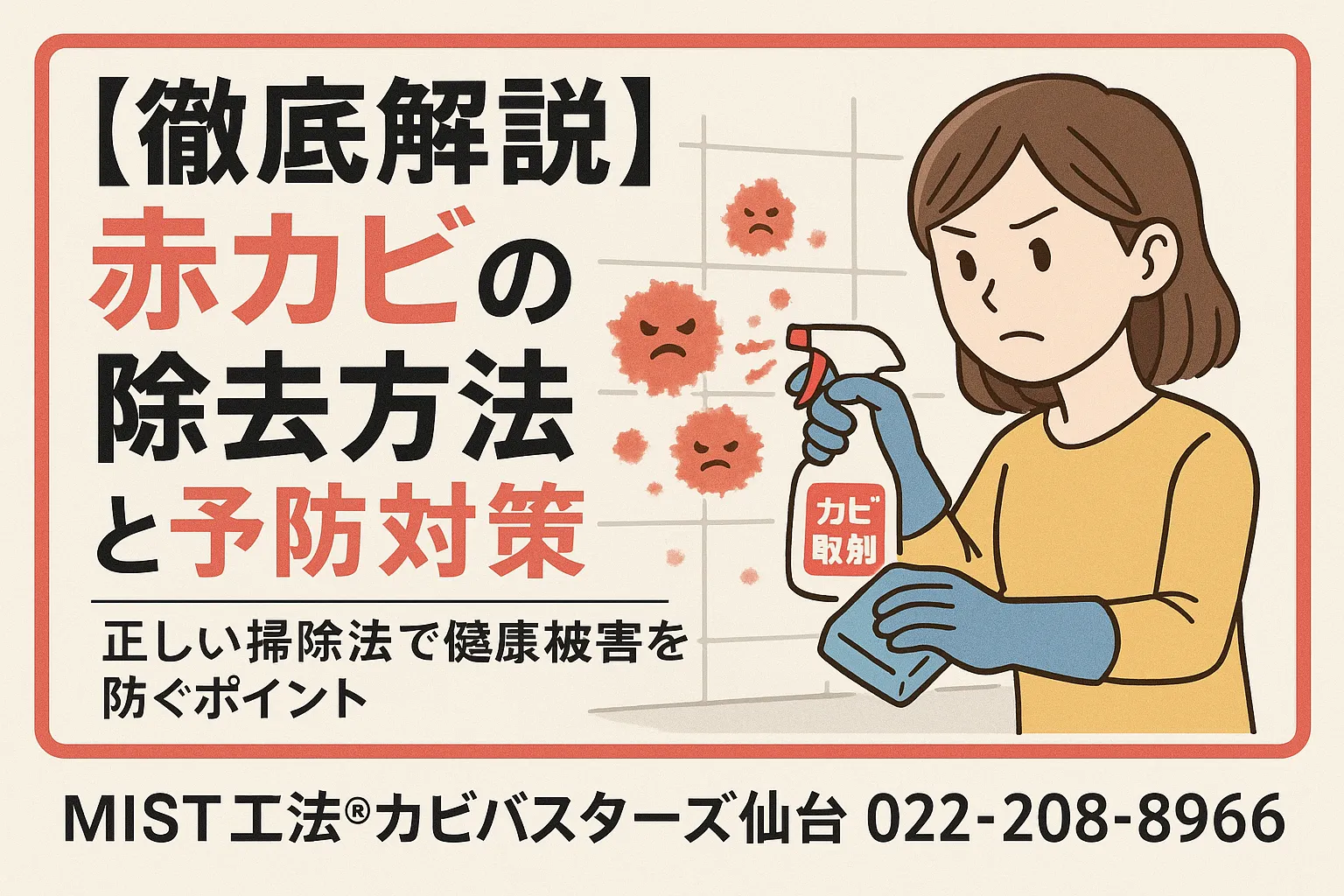快適で清潔な生活空間を維持するために、赤カビは早期に発見・除去し、日常の中で予防を徹底しましょう。そしてもしご家庭でカビ問題にお困りの際は、どうぞお気軽にMIST工法®カビバスターズ仙台へご相談ください。地域密着で、皆さまの住まいを快適に保つお手伝いをいたします🍀