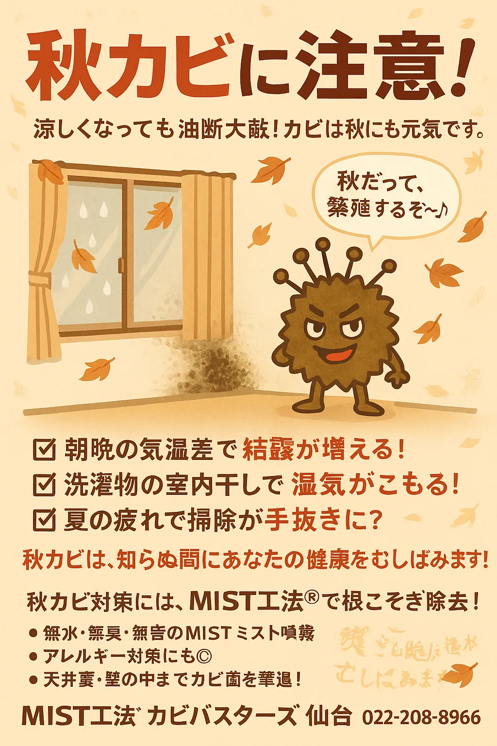 皆さま、こんにちは。MIST工法Ⓡカビバスターズ仙台の稲垣です。
