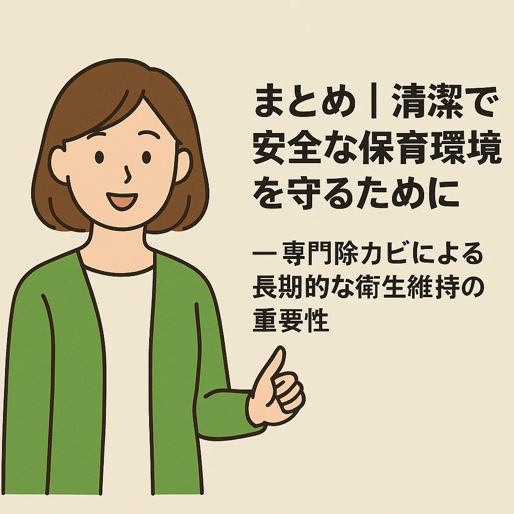 総合的なカビ対策とは、単に1か所を改善するのではなく、環境・設備・管理方法を一体的に整えることです。園児が安全に過ごせる空間を保つためには、施設全体を俯瞰し、カビが発生しにくい環境をつくり続けることが最も効果的なアプローチとなります。